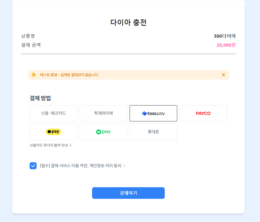 오늘은 어제의 로직을 이어서 이번엔 실제로 결제는 안되지만 결제가 된다는 느낌을 가지는 테스트로 결제를 하게 된다면 다이아를 추가되는 로직을 추가했다.