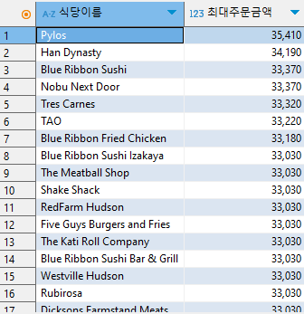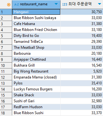 1.음식점별 주문 금액 최댓값 조회하기 - 최댓값 기준으로 내림차순 정렬