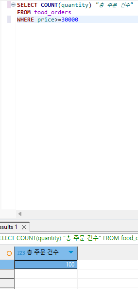 1) [실습] 주문 금액이 30,000원 이상인 주문건의 갯수 구하기