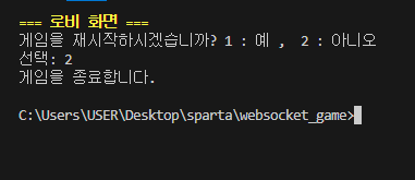 이렇게 "게임을 종료합니다." 라는 문구와 함께 게임이 종료가 되는 걸 볼수가 있다.
