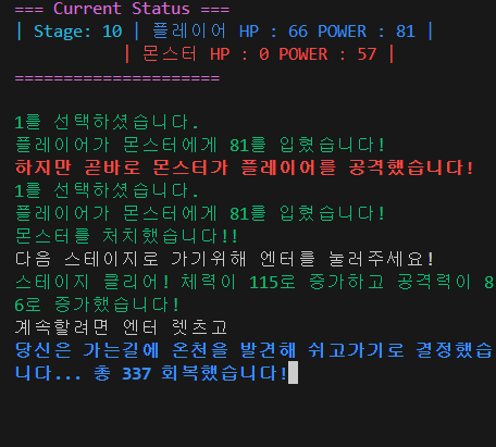 오늘은 좀 개선 한 점은 플레이어가 죽어도 로비로 이동되게 만들었고, 중간에 쉬면서 체력을 회복 할 수있는 온천 시스템을 만들었다!