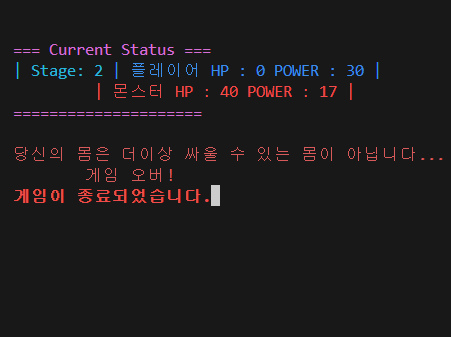 readlineSync.question(chalk.red.bold('게임이 종료되었습니다.'));