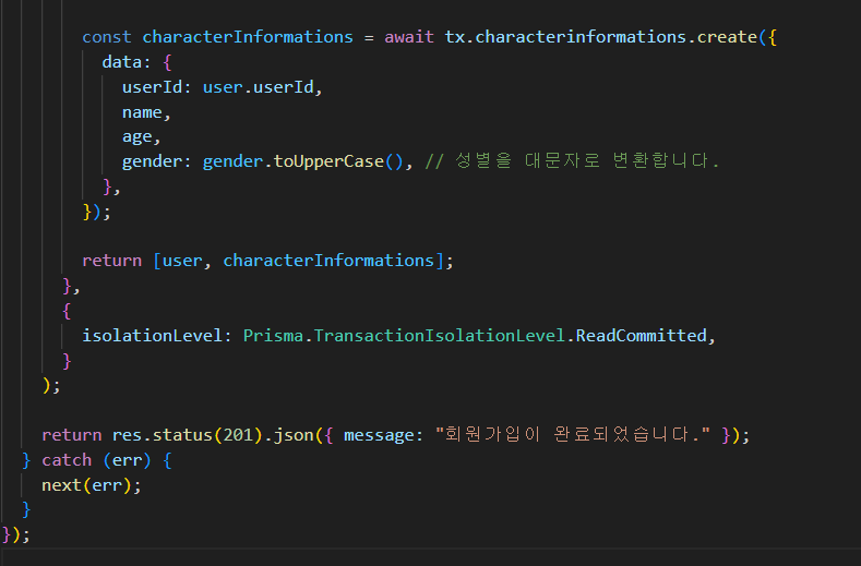 아이디 중복 체크 후, 비밀번호를 해싱하여 데이터베이스에 사용자와 캐릭터 정보를 저장한다.