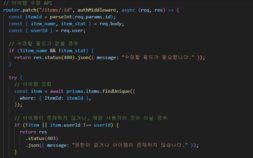 router.patch("/items/:id", authMiddleware, async (req, res) => {